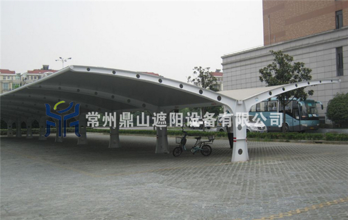 二,膜结构停车棚顶部封板采用白色(颜色可挑选)膜布封顶,与车棚整体骨架用压条铆接固定,耐酸碱腐蚀,有足够强度对棚内车辆起到保护作用;